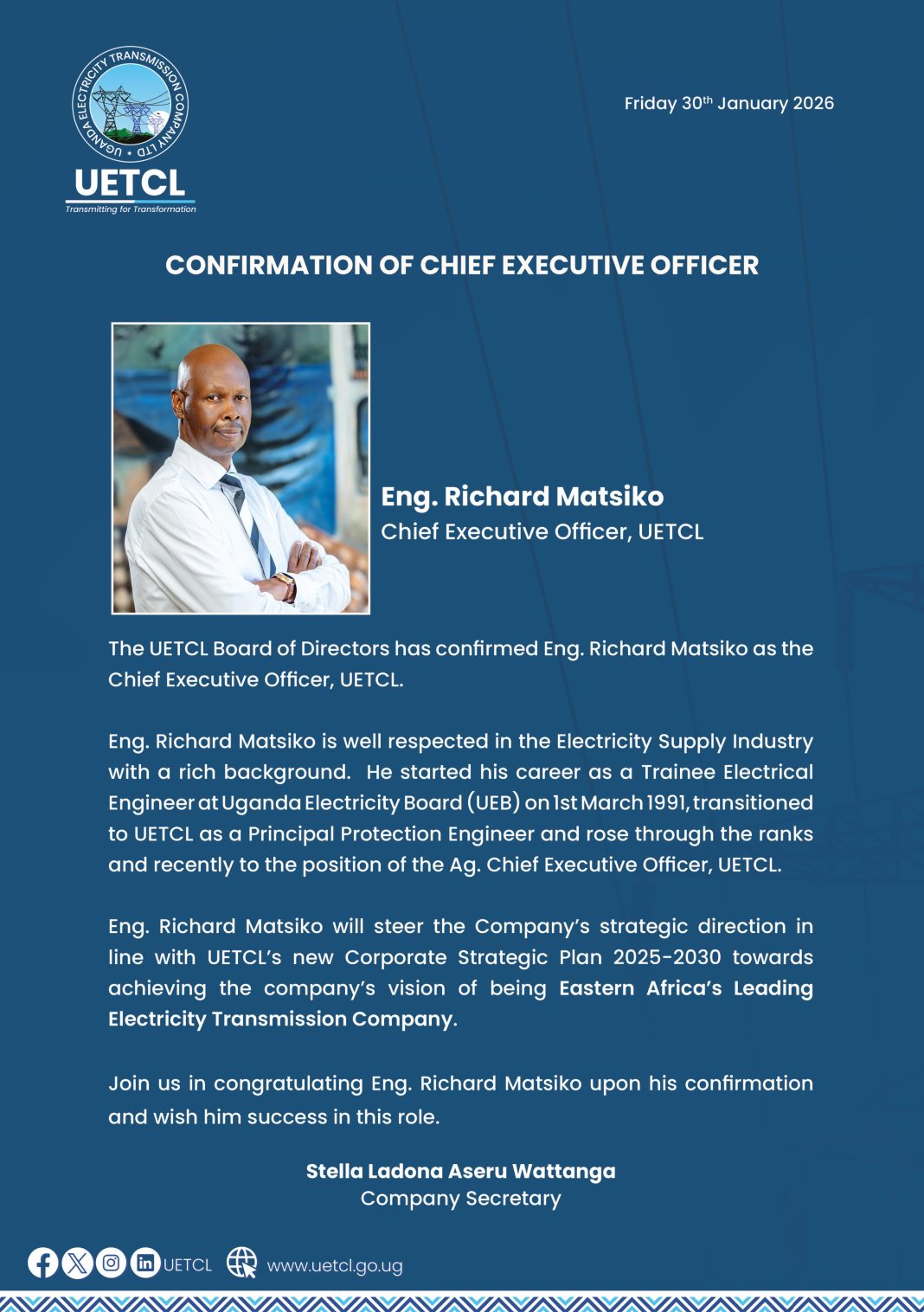 - Matsiko, an electrical engineer with over 30–35 years of experience in Uganda’s power sector (starting as a trainee in the early 1990s), is now tasked with leading the company through its Corporate Strategic Plan 2025–2030, aiming to position UETCL as a leading electricity transmission utility in Eastern Africa.
